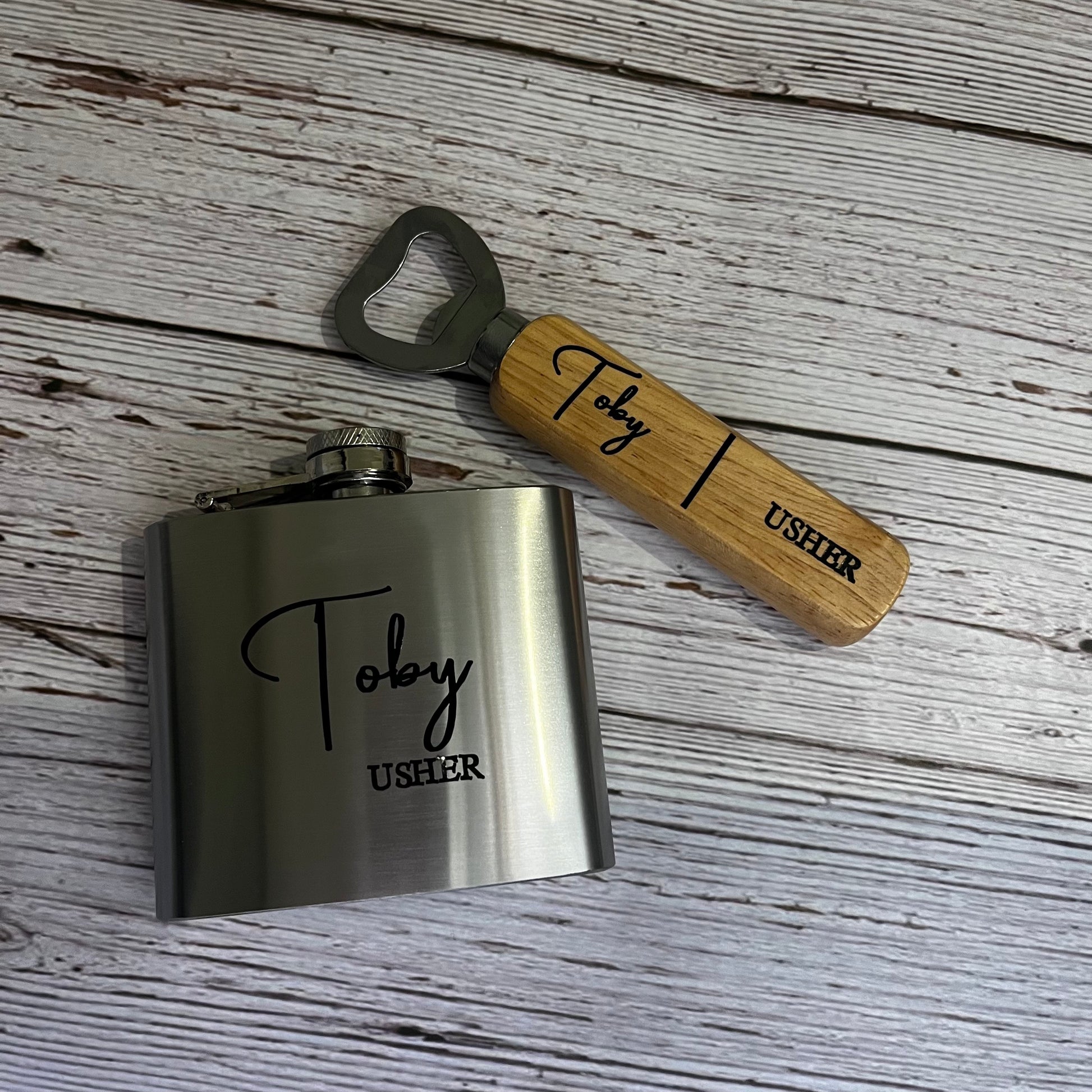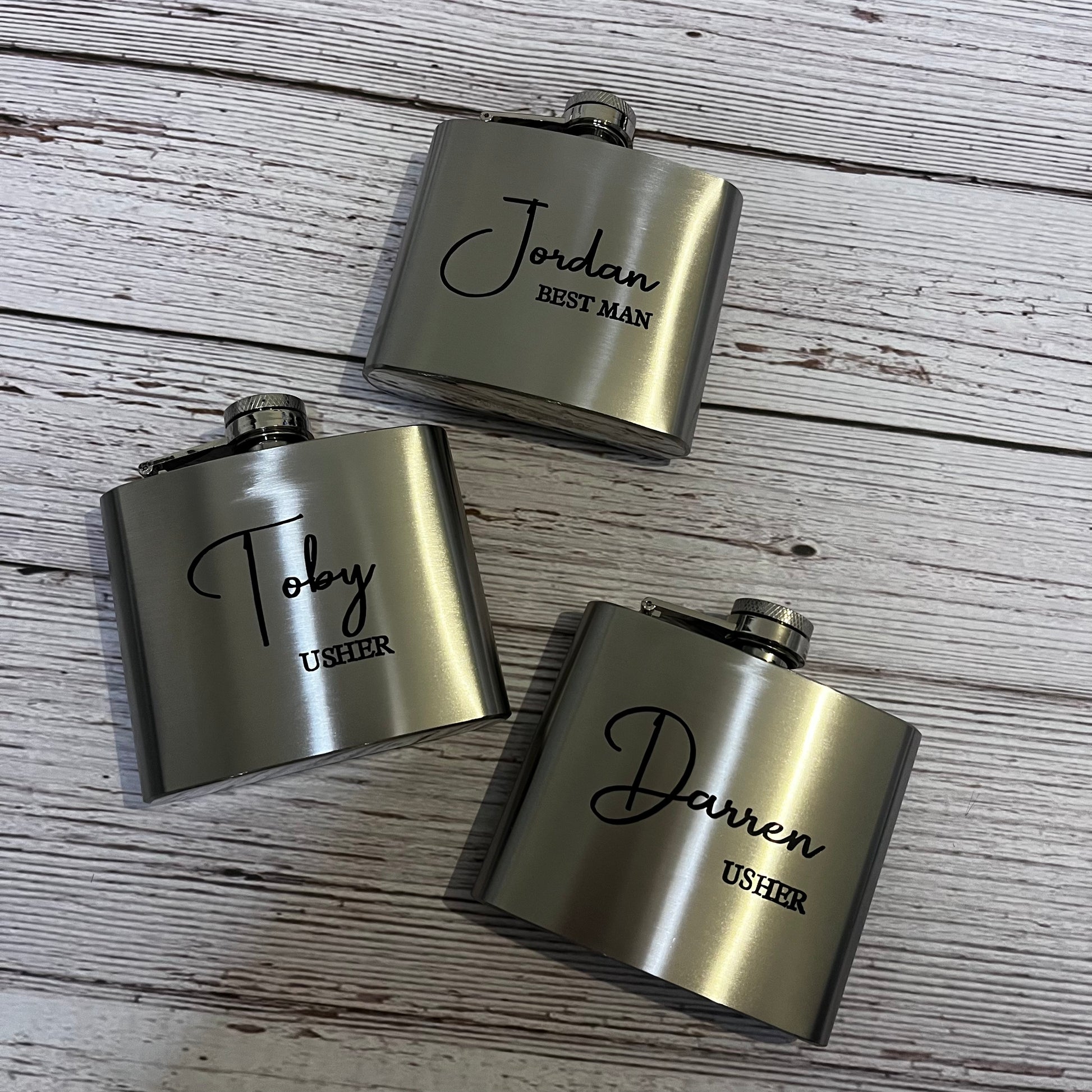 Thank your groomsmen in style with our personalised Hip Flask, a classic and practical gift they'll appreciate long after the wedding day. Customised with their name, role and or wedding date.